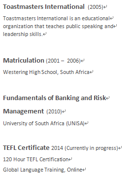 國籍: 南非       求職意向: 教師
