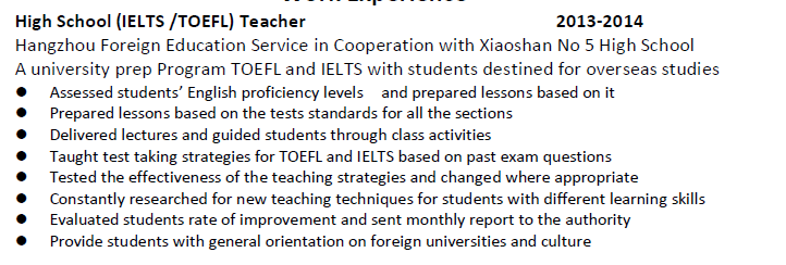 1.外教可以盡快到崗, 2,外教有工作簽證,可以教托福、雅思。 3,外教有豐富的教學經(jīng)驗。 |