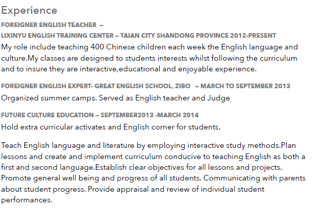 1,外教有教學(xué)經(jīng)驗(yàn),現(xiàn)在山東泰安,有長(zhǎng)期簽證,可以全職工作。 2,可以中文溝通。 |