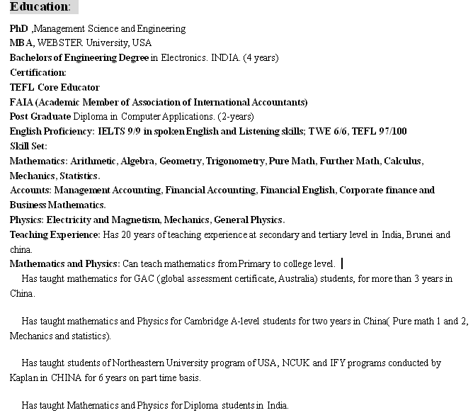 1,外教現(xiàn)在四川成都,可以盡快到崗, 2,外教可以教數(shù)學(xué),科學(xué),英語。 |