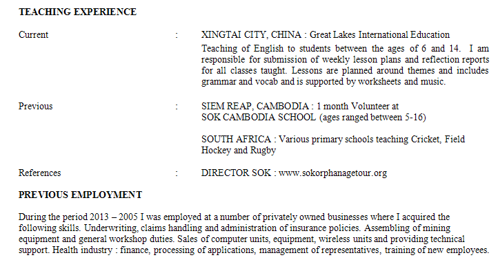 國籍: 南非       求職意向: 教師