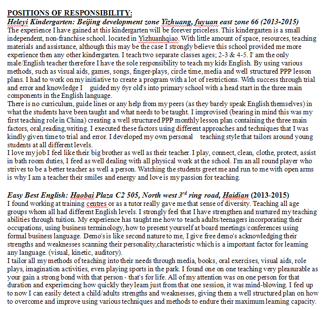 外教有幼兒園的教學,有本科,有TEFL, 但是只能在北京工作 |