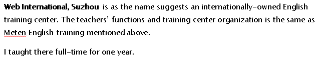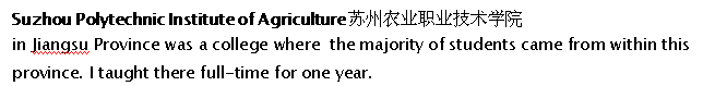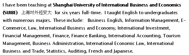 65歲加拿大外教 經(jīng)濟學本科 之前在上海對外經(jīng)貿(mào)大學教了6年經(jīng)濟學 金融管理,商務英語,國際會計學,在蘇州農(nóng)業(yè)職業(yè)技術學院教過一年,在蘇州韋博教過一年 現(xiàn)在馬來西亞 |