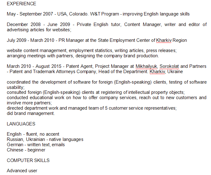 烏克蘭美女外教求職上海的職位,您好,我最近搬到了上海,是因?yàn)槲液椭袊?guó)的非常優(yōu)秀的人結(jié)為夫妻。我畢業(yè)于烏克蘭的一所大學(xué),專業(yè)是英語(yǔ)和俄語(yǔ)的翻譯以及英語(yǔ)語(yǔ)言。在過(guò)去的5年里,我一直在Patent agent 工作,有了相關(guān)的工作技能。同時(shí),我在視頻中提到的信息,您可以在簡(jiǎn)歷中看到。謝謝,等待您的答復(fù)。