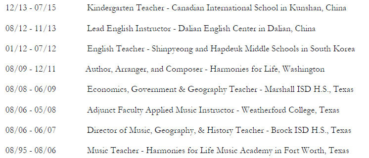 美國男 音樂本科 教育碩士 10年以上教學(xué)經(jīng)驗 教過英語 音樂 地理 歷史 |