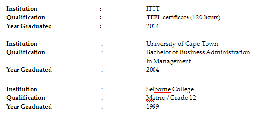 國籍: 南非 求職意向: 教師
