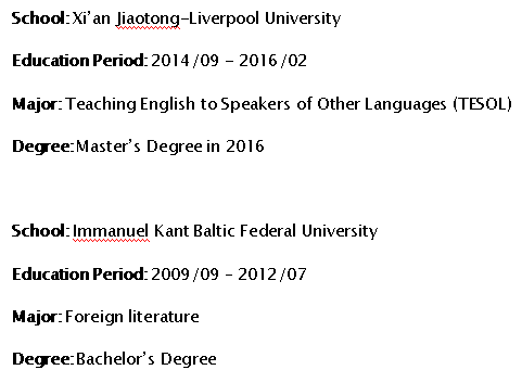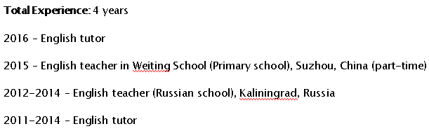 俄羅斯女 本科TEFL 2016年碩士畢業(yè) 小孩成人經(jīng)驗(yàn)都有 但大部分是小孩經(jīng)驗(yàn) 蘇州最好 因?yàn)橹霸谔K州教過(guò) 其他城市也可以接受 |