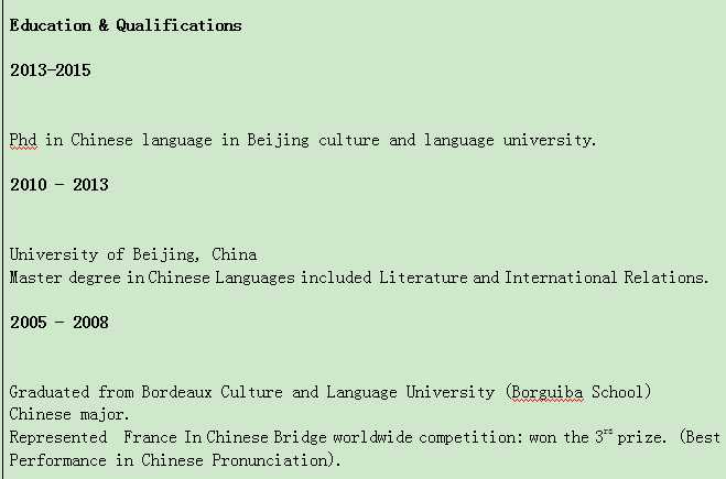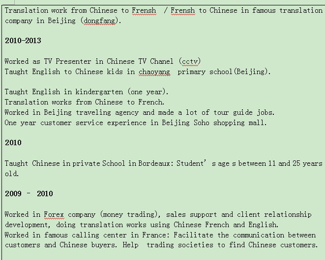 會中文的外教求職北京附近,你好,我現(xiàn)在錄制這個視頻介紹一下我的工作經(jīng)驗以及我的性格特點。我有幼兒教學(xué)經(jīng)驗,在幼兒園,培訓(xùn)學(xué)校工作過。我可以自己制作游戲,同時準(zhǔn)備教學(xué)材料。我性格外向,活潑開朗。