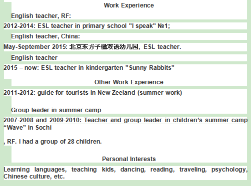 北京的俄羅斯女外教求職全國(guó),我是Tina, 22歲?,F(xiàn)在北京。我在俄羅斯有2年的教學(xué)經(jīng)驗(yàn),在北京有6個(gè)月的教學(xué)經(jīng)驗(yàn)。我通過(guò)電影,歌曲,卡通圖畫教孩子們英語(yǔ)。他們能夠?qū)W習(xí)歌曲,數(shù)字通過(guò)我的活動(dòng)。