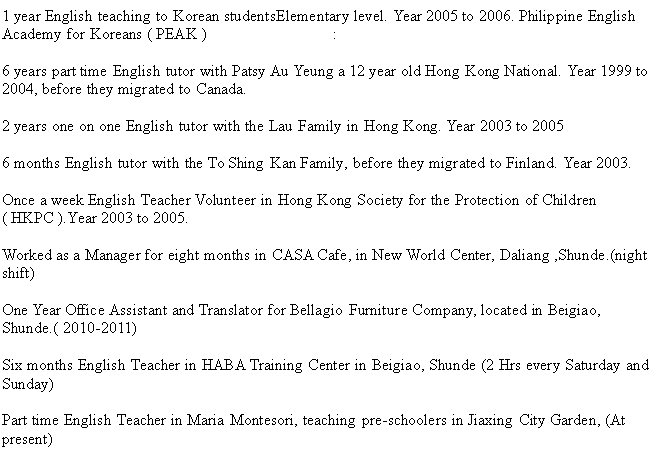 菲律賓女 在順德家屬簽 教學(xué)經(jīng)驗(yàn)豐富 求職順德或附近 可盡快到崗 |