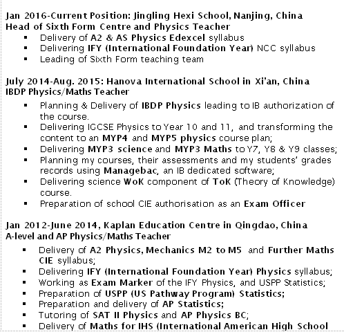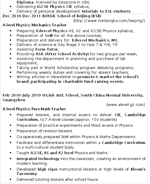 英國(guó) 64年 現(xiàn)在南京工簽到7月中旬 8年A Level經(jīng)驗(yàn) 教過IBDP physics, MYP maths and AP and SAT II Physics 求職下學(xué)期物理數(shù)學(xué)或head of science department職位 薪資要求27000稅后 有一中國(guó)老婆和8歲的兒子 不挑地方 |