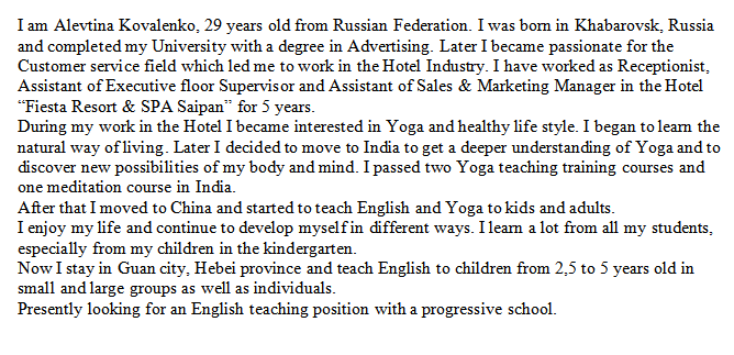 國籍: 南非 求職意向: 教師