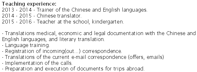烏克蘭 中英文翻譯專業(yè)本科 漢語四級 2.5年教學經驗 現(xiàn)在本國 求職深圳 簽證自理 |