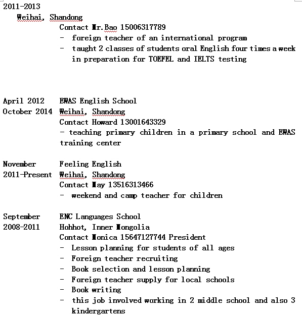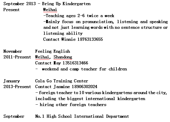 加拿大 本科TEFL 團(tuán)聚簽 現(xiàn)在威海 求職北京或其他待遇好的城市 15000以上 幼兒園到大學(xué),培訓(xùn)機(jī)構(gòu)等都有經(jīng)驗(yàn) |