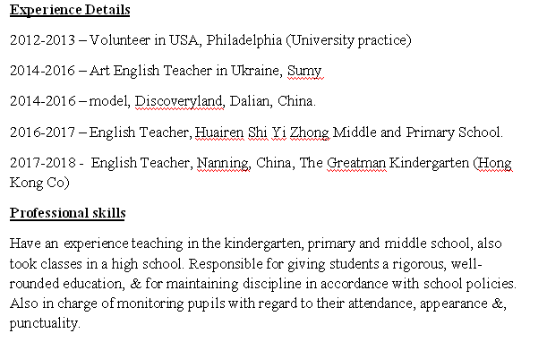 烏克蘭, 工簽資料齊全,英語專業(yè),在中國有3年經(jīng)驗。 求職可以辦理工簽學校 |
