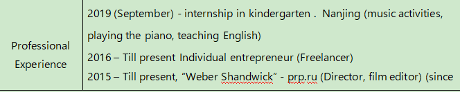 本科,音樂專業(yè), 鋼琴家,音樂老師,歌手,電影制作人 , 現(xiàn)于南京,家庭簽,發(fā)音好,11k 住宿,后期可申請工簽 |