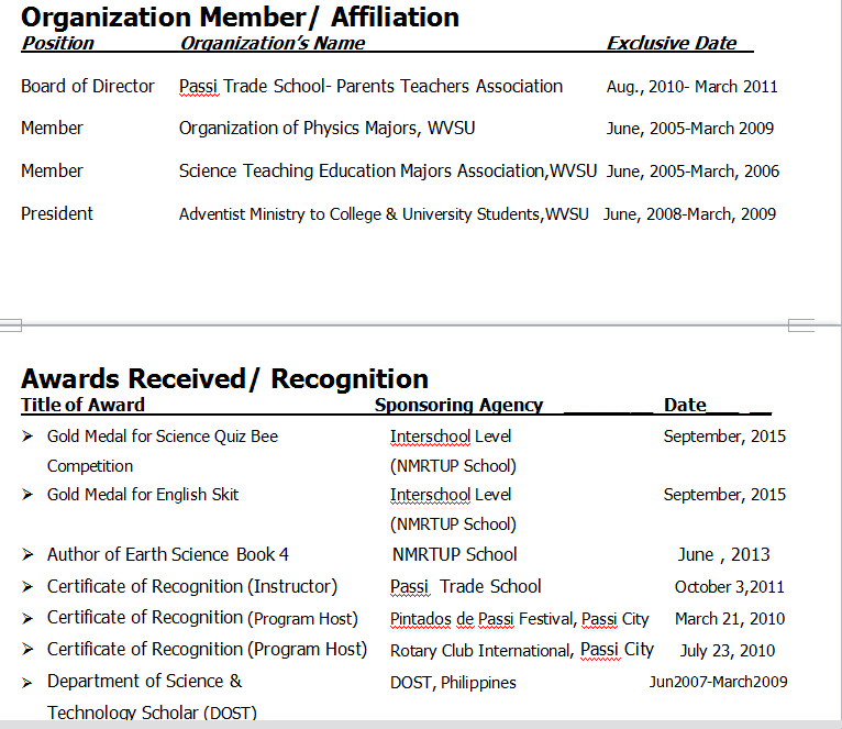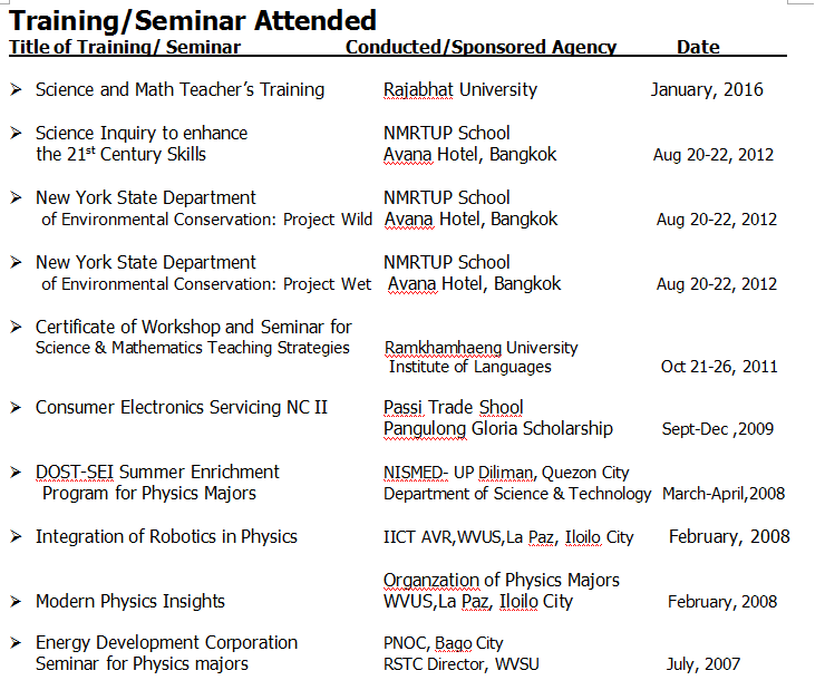? Physics Teacher Nawamintharachinnuthit Triamudomsuksapattanakarn Jan, 2012- present School, Bang bo, Samutprakarn, Thailanad ? College Instructor Passi Trade School (Government School) June 2009- Oct 4, 2011 and Data Encoder ? Teacher (OJT) Iloilo National High School, School for the Arts Jan.2009- March 2009 Teacher (OJT) West Visayas State University,