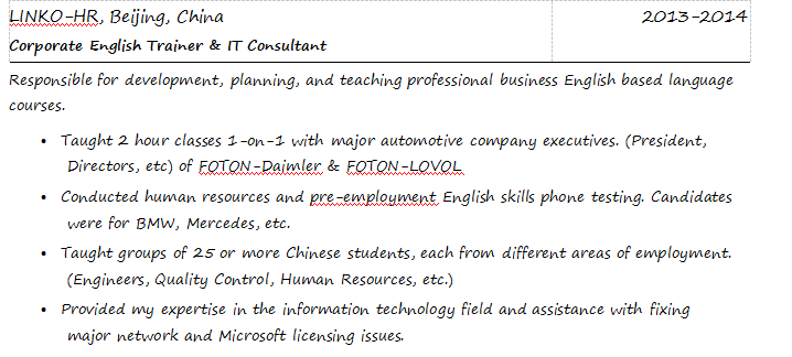 外教的工作經(jīng)歷