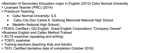 英語教育專業(yè)本科,有TEFL,有托福雅思教學(xué)經(jīng)驗(yàn)。 |