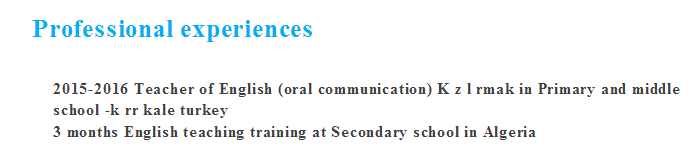 阿爾及利亞人,現(xiàn)在土耳其,英語專業(yè)本科,有教學(xué)經(jīng)驗,可以盡快上崗。 |