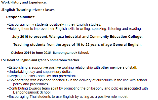 August 2012 to October 2014. Satit Udomseuksa School. ESL teacher to primary 1 through to primary 6. Responsibilities: · Establishing a supportive positive working relationship with other members of staff. ·Undertaking play and supervisory duties. ·Keeping the classroom tidy and presentable. ·Co-operating with assigned teacher(s) in the delivery of curriculum in the line with school policy and procedures. ·Contributing towards team spirit by promoting the philosophy and policies associated with Satit School. ·Encouraging Thai students to use English by acting as a positive role model. ·Covering for the class teacher during times of emergency. ·Ensuring students are safe and engage in purposeful activities.