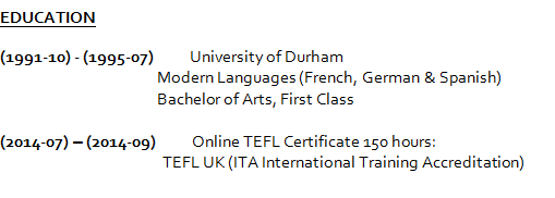 本科有TEFL,找公立或者國(guó)際學(xué)校職位。4年教學(xué)經(jīng)驗(yàn),在中學(xué)教過(guò),可以教托福商務(wù)英語(yǔ)。 |