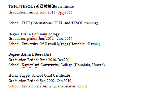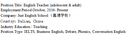 本科有TEFL,現(xiàn)在大連,兩年左右教學(xué)經(jīng)驗(yàn),盡快上崗。 |