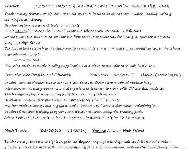 碩士有TESOL,六年左右英語數(shù)學計算機教學經(jīng)驗,求職上海高中或者大學職位。 |