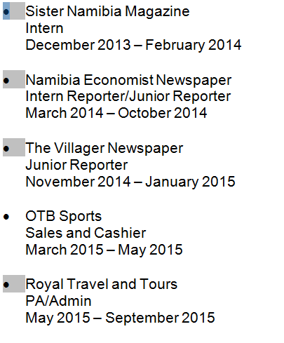 Tertiary Institution: Polytechnic of Namibia Programme Enrolled: Bachelor of English Year Enrolled: 2012 Present Level: Graduated (April 2016)