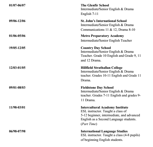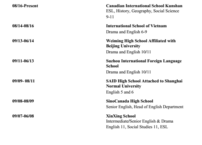 十多年教學經(jīng)驗,中學經(jīng)驗比較多。有英語和教育本科雙學位,碩士專修戲劇,教過歷史地理,做過戲劇老師。剛結(jié)束一個國際學校合同,需要工簽轉(zhuǎn)聘。