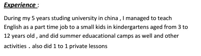 兼職教學(xué)經(jīng)驗(yàn),想教3-12歲學(xué)生,簽證自理,盡快上崗。 |