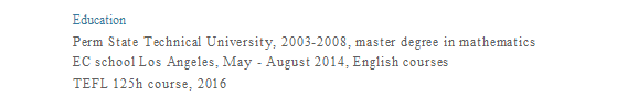 俄羅斯男,碩士學(xué)位,有TEFL,工作經(jīng)驗(yàn)豐富 |