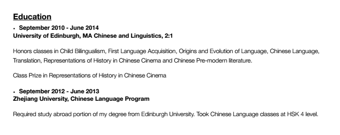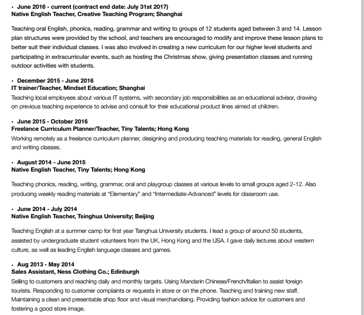 愛丁堡大學(xué)中文語言學(xué)專業(yè)碩士,2-14歲教學(xué)經(jīng)驗(yàn)為主。 |