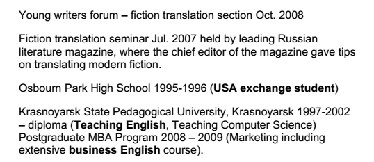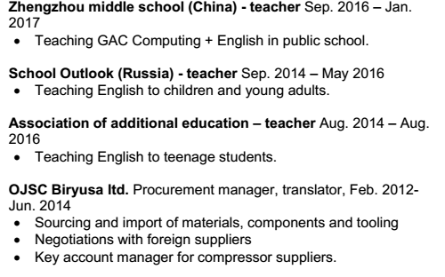 英語和計算機科學專業(yè)畢業(yè)。教學經(jīng)驗。自理商務(wù)簽。 |
