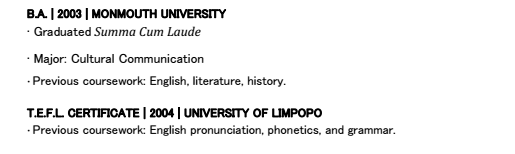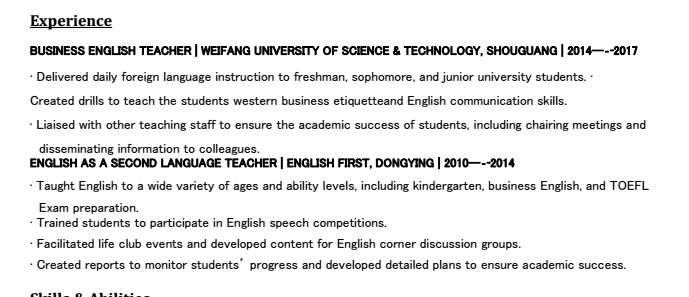 美國(guó)取得的本科學(xué)位,TEFL,多年教學(xué)經(jīng)驗(yàn),發(fā)音不錯(cuò) |