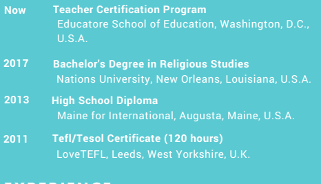 TEFL教學(xué)經(jīng)驗(yàn),高中本科學(xué)歷都是美國(guó)取得,有工簽。 |