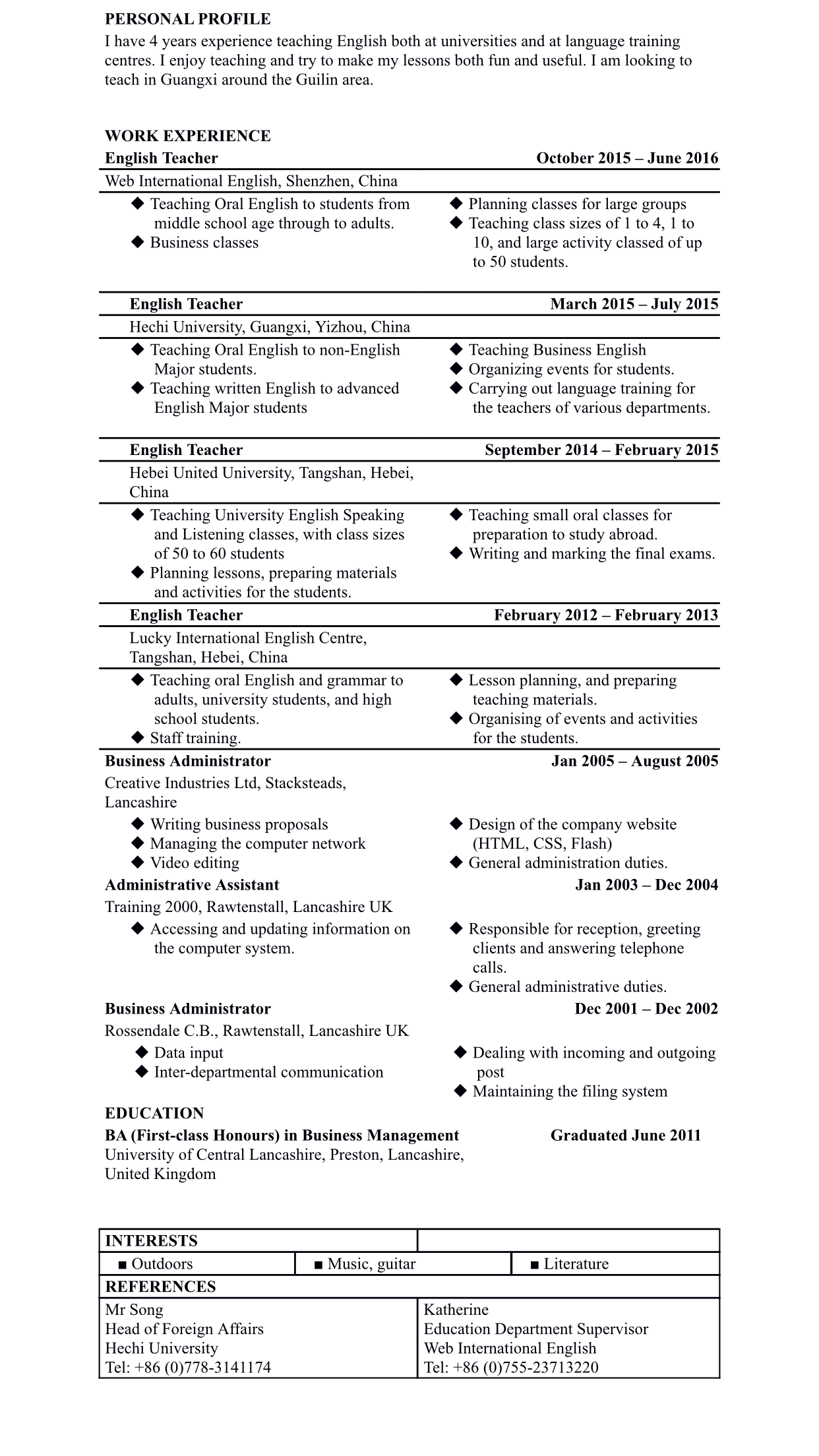 國籍: 英國 求職意向: 教師