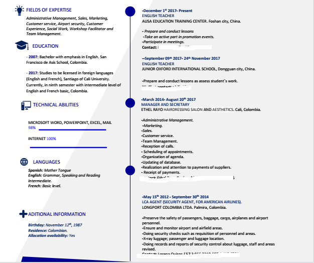 西班牙語為母語 英語流利沒有口音 隨時到崗 |