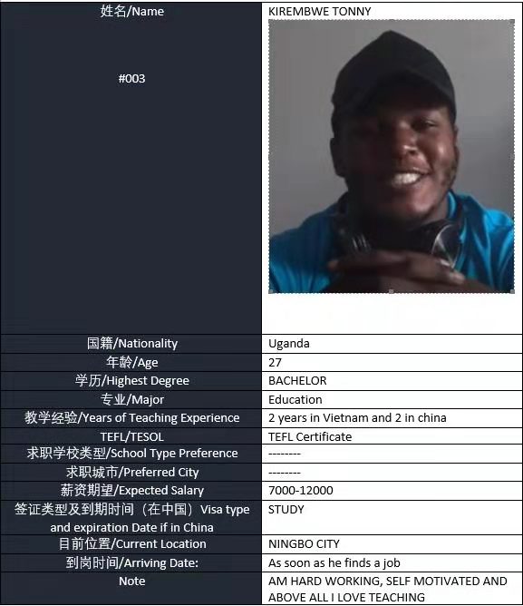 國籍: 未知 求職意向: 教師