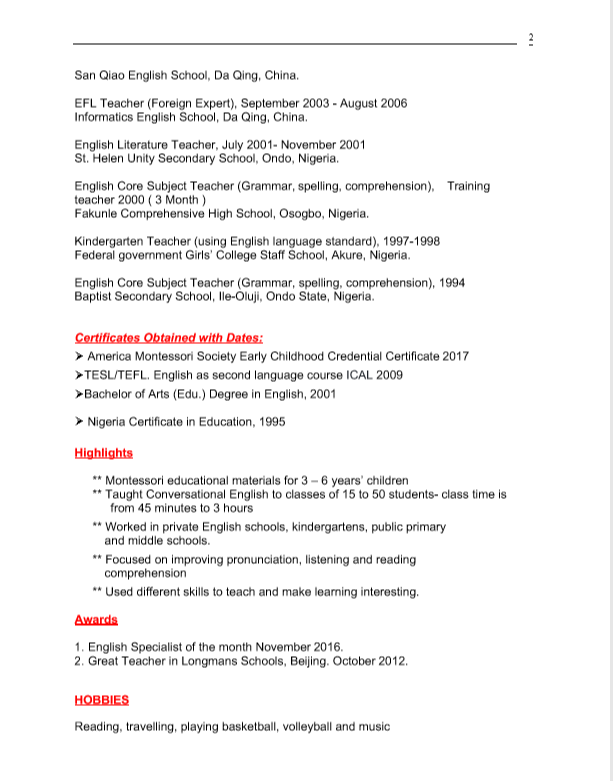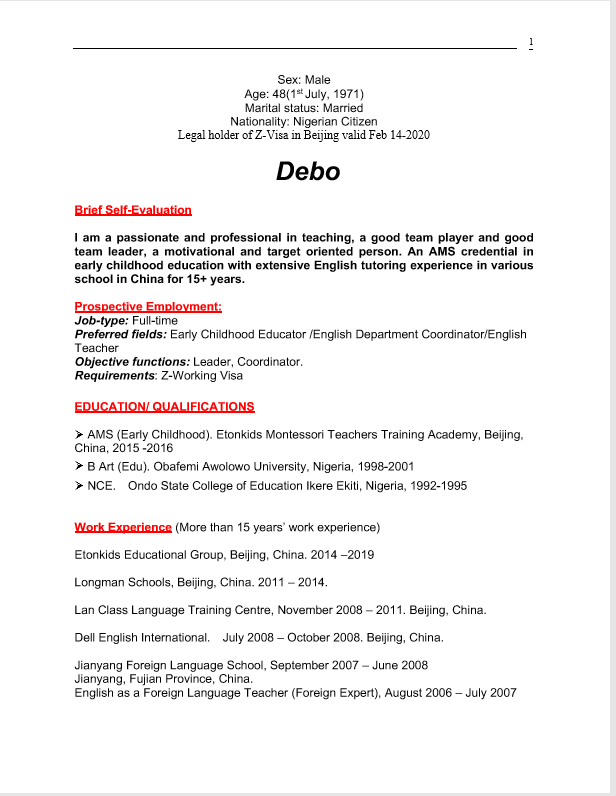 英語(yǔ)教育專(zhuān)業(yè)畢業(yè),2020年將獲得教育領(lǐng)導(dǎo)與管理碩士學(xué)位,擁有15年以上工作經(jīng)驗(yàn),工簽到期轉(zhuǎn)簽證,2020年2月可到崗。 |