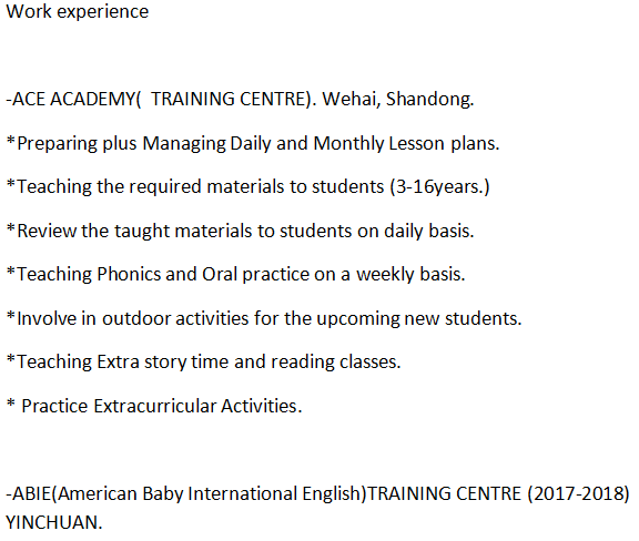 外教英語專業(yè) 在愛貝工作過 有很好的工作經(jīng)驗(yàn) 口音很好很清晰 老公中國人 家在深圳 求職深圳 |