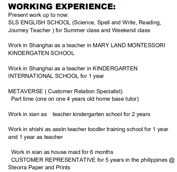 菲律賓女 目前在上海 Q2簽證明年11月份到期 有幼兒園和培訓學校經(jīng)驗 丈夫在江西任酒店經(jīng)理,求職江西或湖北最好,其他城市也考慮,薪資13K+加住宿 |
