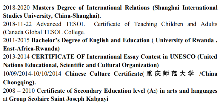 2005 – 2007 Ordinary level (O'level) at Ecole Technique Saint Kizito (Butare –