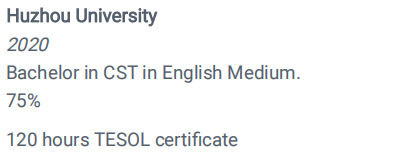 形象好,口音不錯(cuò),。有親和力,教育經(jīng)驗(yàn)豐富,有工簽,TESOL 盡快上崗 |