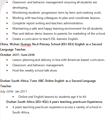 國籍: 津巴布韋 求職意向: 教師