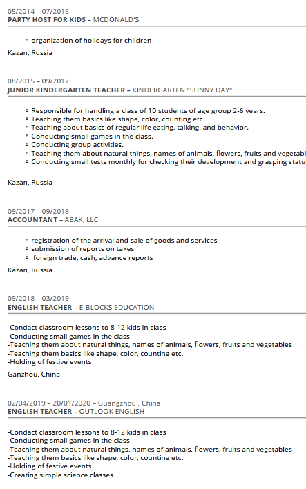 國籍: 俄羅斯 求職意向: 教師