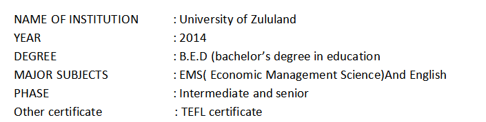 國(guó)籍: 津巴布韋 求職意向: 教師