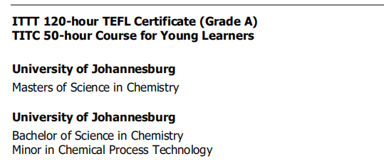 國籍: 津巴布韋 求職意向: 教師