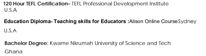 Kay,加納,現(xiàn)居江蘇泰州,本科,17-19k,TEFL,3年經(jīng)驗,江蘇浙江城市,口音不錯。 |