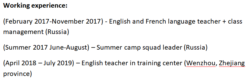 現在可以做兼職,也找全職,打算來中國,本科英語教育專業(yè),口音可以。 |